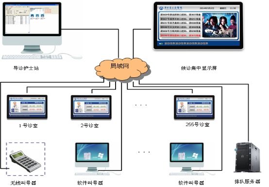 系统主要由诊室一体机、等候区集中显示一体机、护士站分诊导诊台、服务器端平台软件构成。可根据每个医院的需求,与HIS、PACS、LIS/PEIS、药房系统对接,可扩充定制微信公众号平台预约等功能。